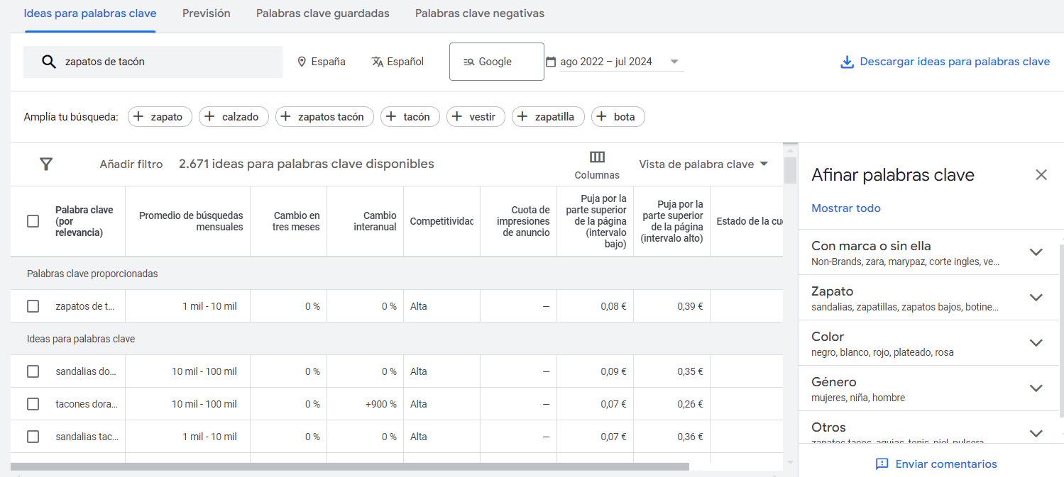 Por ejemplo, si nuestra palabra clave es «zapatos de tacón», podemos añadir «zapatos de tacón bajo» o «zapatos de tacón El Corte Inglés».
