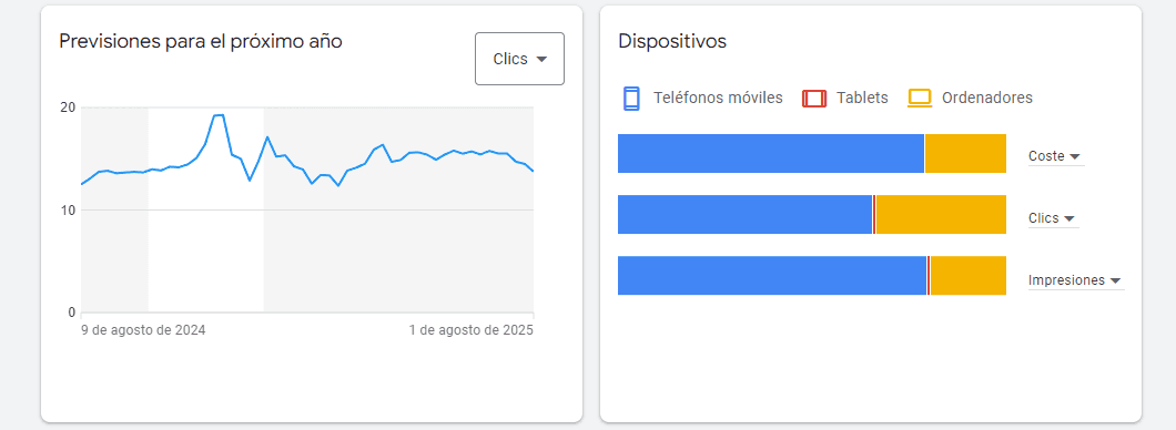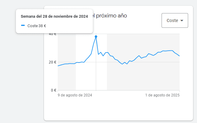 Por ejemplo, en esta imagen podemos ver que los picos de clics serán en noviembre y diciembre, coincidiendo con el Black Friday y la Navidad. Esto implica que el coste para esa palabra clave en esas fechas también asciende, como vemos en la siguiente imagen: