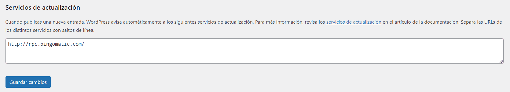 Aquí el apartado destacado es el de «Servicios de Actualización». Este servicio sirve para notificar a los diferentes servicios de actualización un nuevo artículo que has publicado en tu Web.