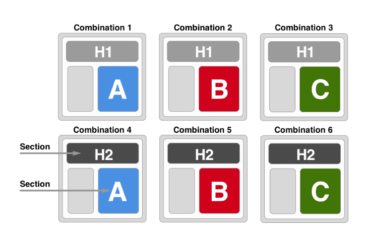 Observando la imagen inferior, verás que si combinamos todas las opciones ya no tendremos únicamente una opción de “control” y una opción “B”, sino que, en total, tendríamos 6 variantes. Y de entre todas ellas saldrá la ganadora.