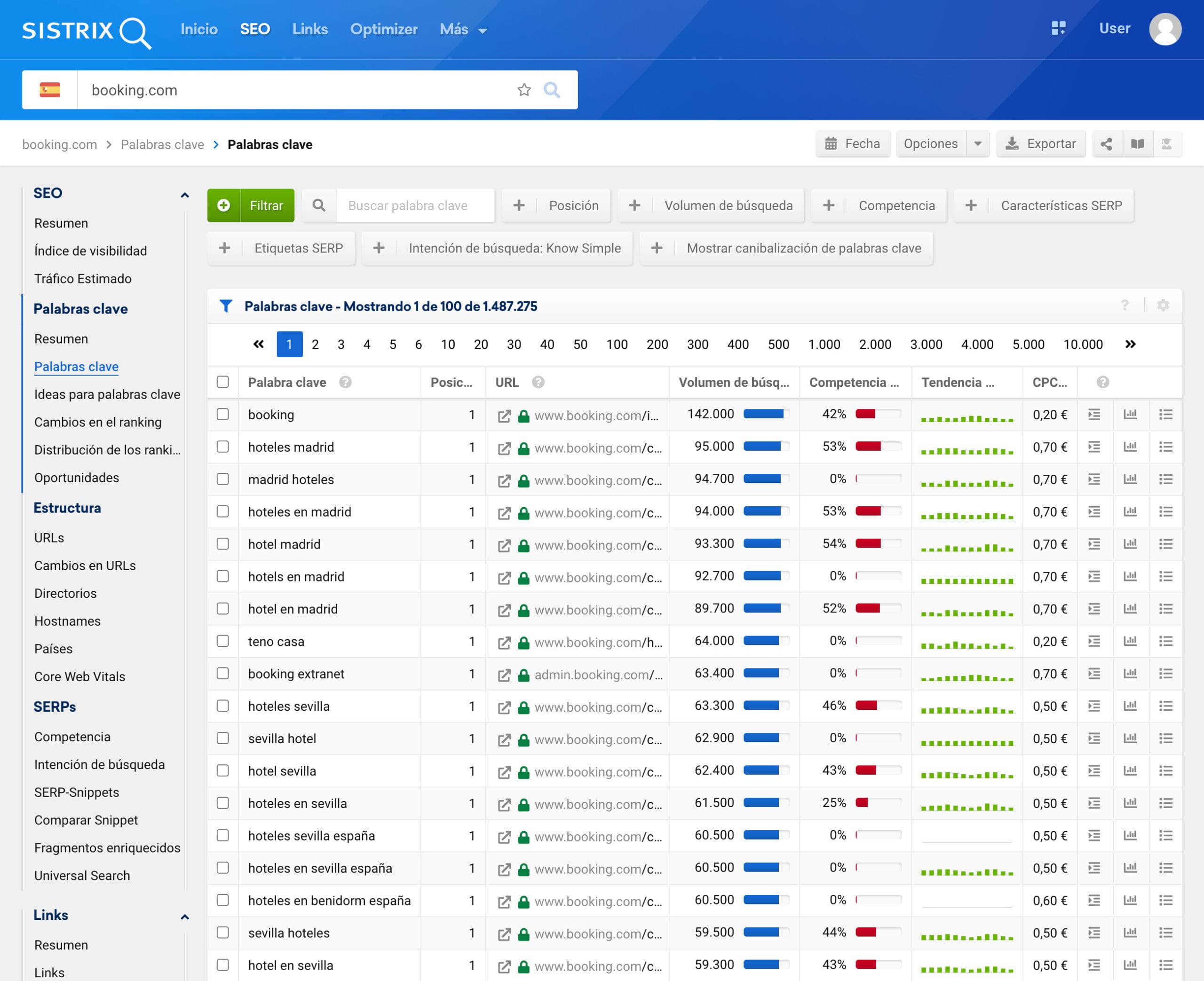Con un funcionamiento similar a la anterior herramienta, Sistrix muestra las palabras clave por las que un sitio web está posicionando y el rendimiento de esas keywords.