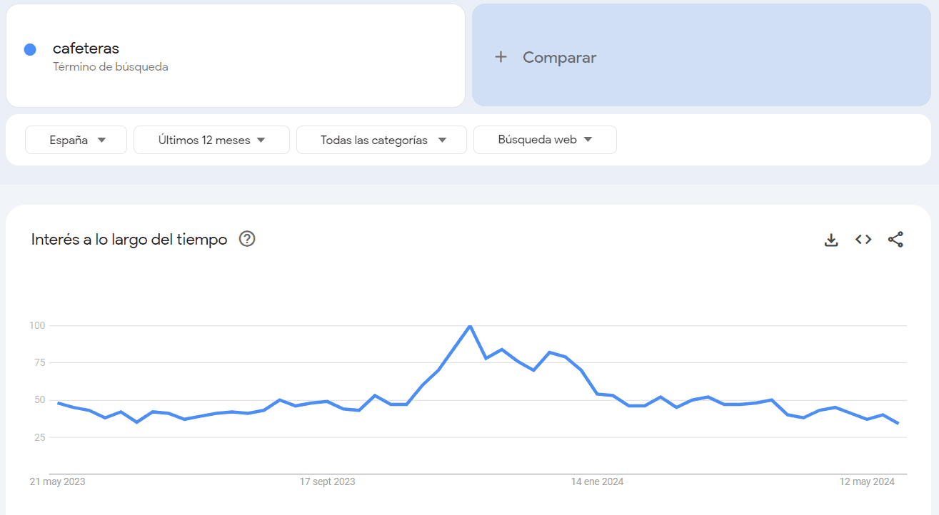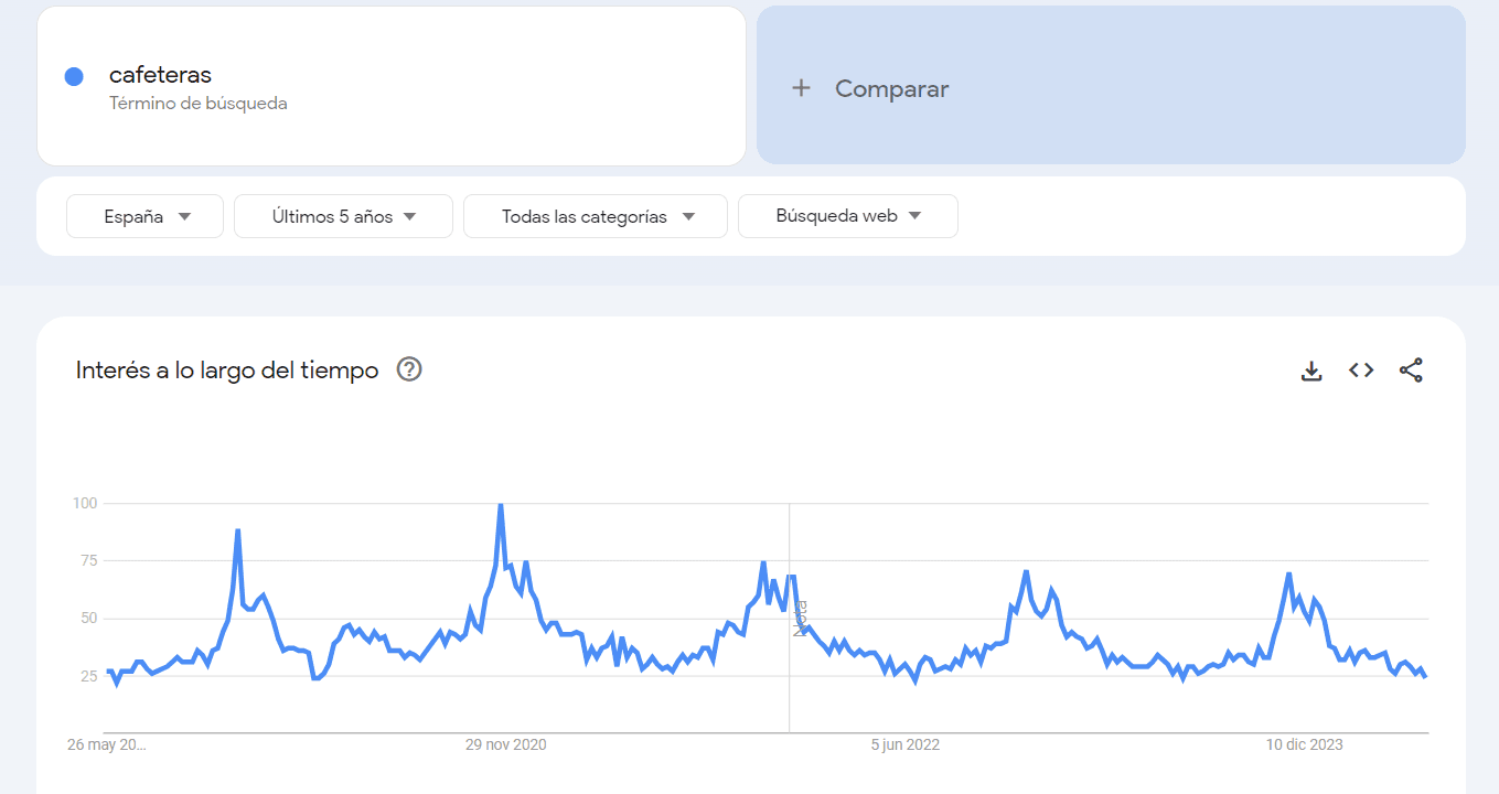 Ingresa una palabra clave en la caja de búsqueda. Por ejemplo, si ingresamos «cafeteras», Google Trends mostrará la popularidad de este término a lo largo del tiempo.