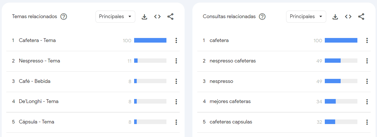 Al buscar «cafeteras», observamos picos de interés en noviembre y diciembre, coincidiendo con el Black Friday y las Navidades. Además, las consultas relacionadas como «cafeteras Nespresso» y «mejores cafeteras» muestran términos específicos que la gente está buscando.