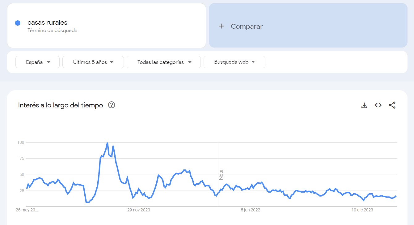 Buscar «casas rurales» revela un aumento significativo de interés durante los meses de verano y un pico inesperado en abril de 2020, probablemente debido a la pandemia de COVID-19. Esto indica que las personas buscan escapadas rurales durante ciertas épocas del año y en situaciones especiales.