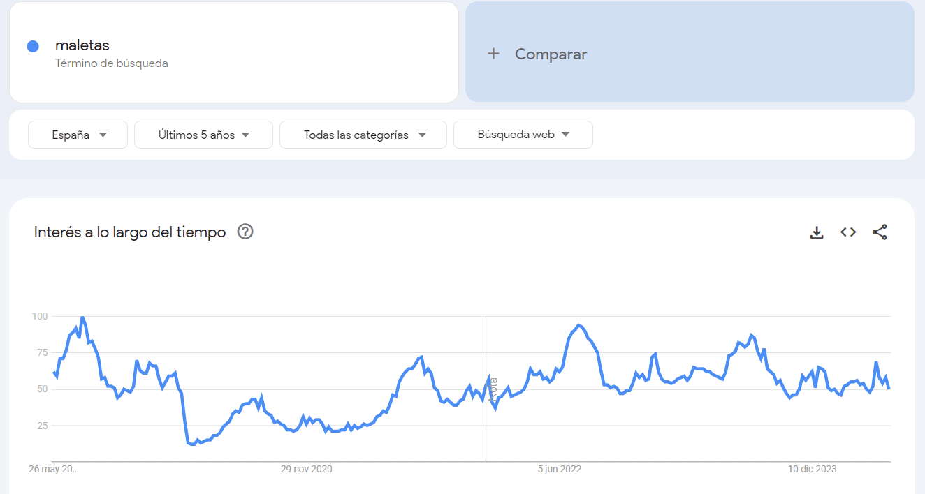 Para «maletas», los datos muestran picos constantes en los meses de verano, lo que coincide con la temporada de vacaciones. Sin embargo, hubo una disminución en 2020 debido a la pandemia, reflejando la reducción en los viajes.