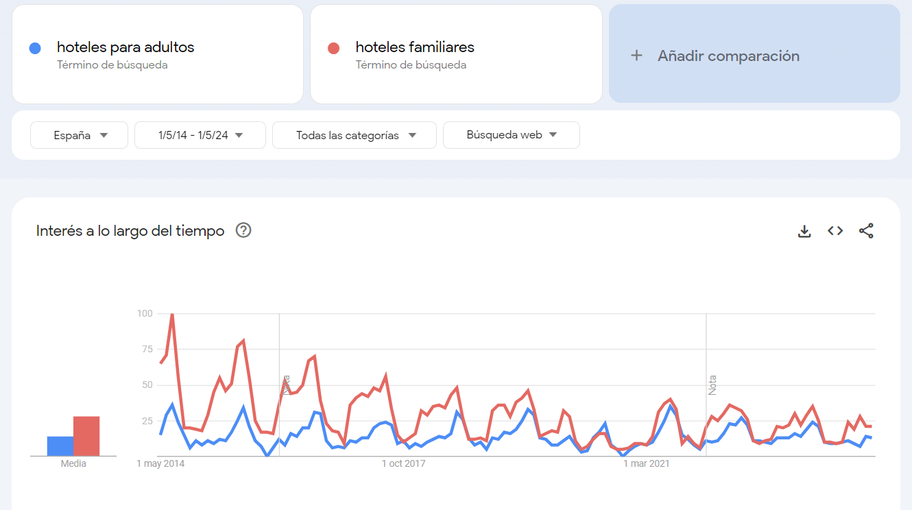Comparar «hoteles para adultos» y «hoteles familiares» muestra un cambio en las preferencias de los consumidores. Mientras que hace 10 años los hoteles familiares eran más buscados, ahora los hoteles solo para adultos están ganando popularidad.